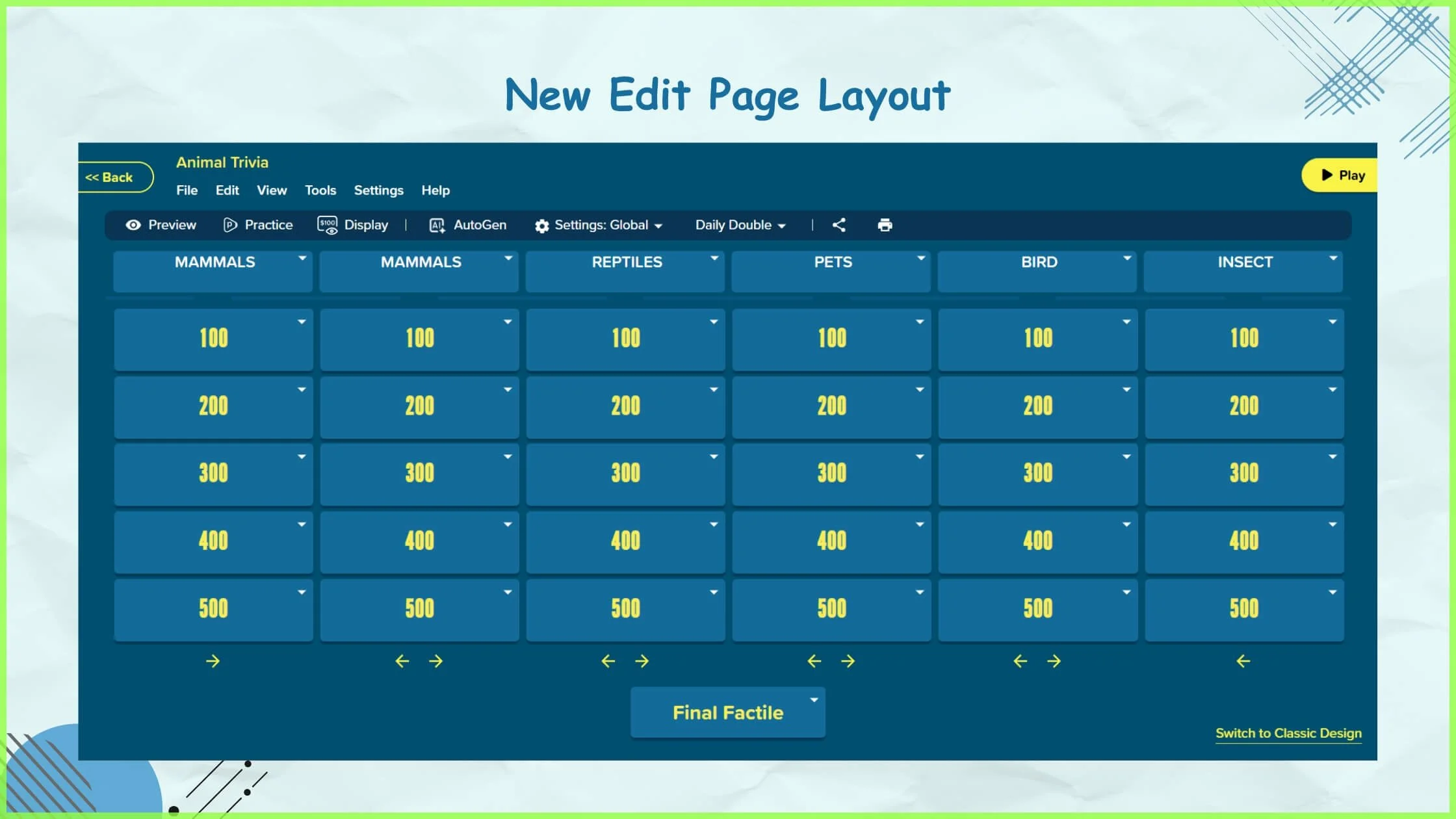 Creating custom Jeopardy games is now easier than ever. The new edit page has been completely redesigned with a fresh, intuitive layout, making it simple to fill in questions and answers, organize categories, and build engaging review games.
